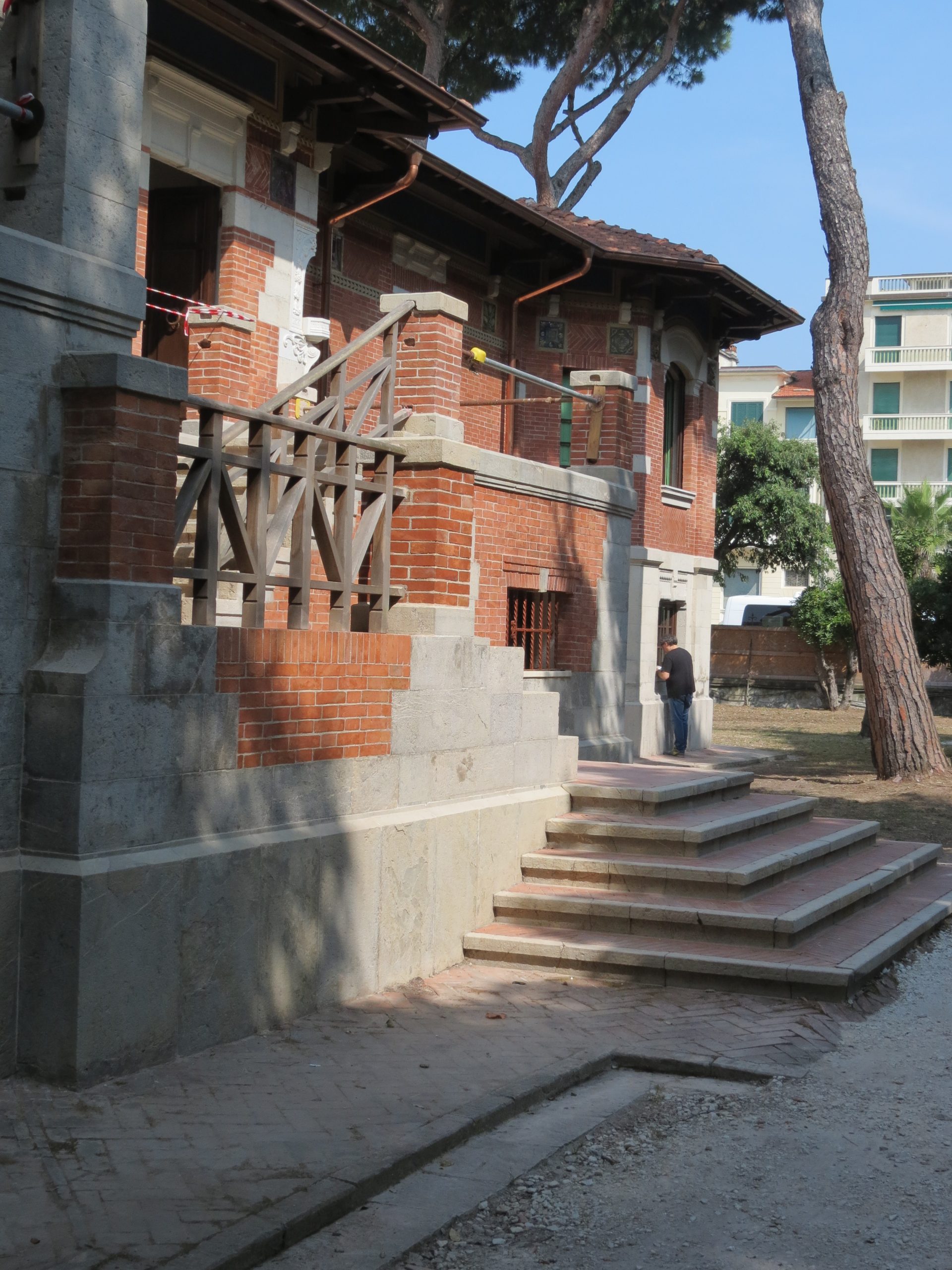 Il primo lotto di lavori ha riguardato prima di tutto la copertura gravemente danneggiata durante la Seconda guerra mondiale e più volte rimaneggiata, la parte più critica e complessa dell’intervento con lo smontaggio e il rimontaggio delle carpenterie a sostegno di ben 18 spioventi, con la sostituzione degli elementi degradati o rotti. Rinnovate anche le gronde e il sistema di raccolta e deflusso delle acque piovane. Particolarmente attento è stato il restauro dei prospetti dall’edificio con i molteplici elementi decorativi, in laterizio, pietra, intonaco, con le formelle di Galileo Chini e gli elementi lignei delle gronde, le travature e le transenne ancora fedeli al progetto originale.